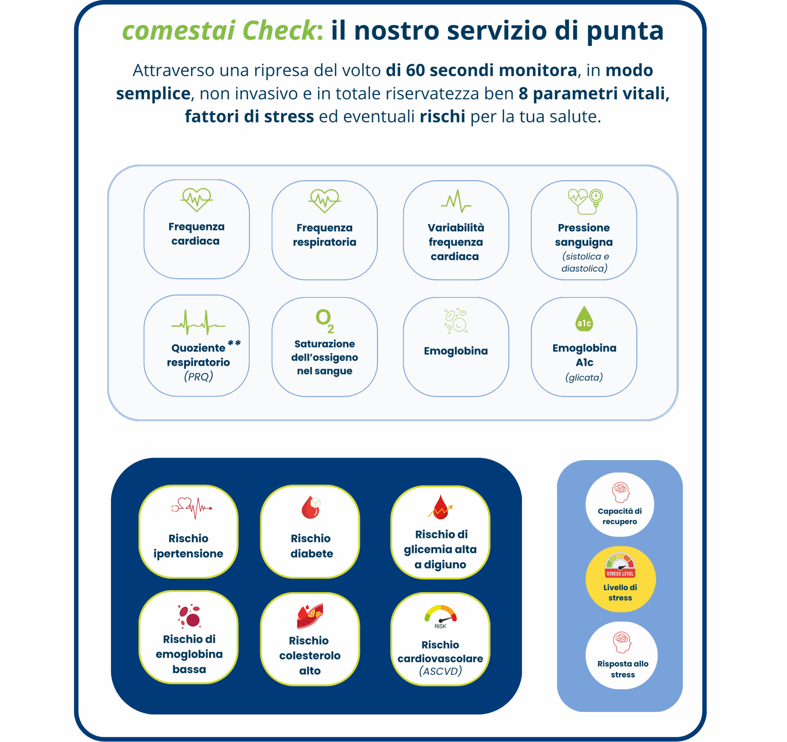 Monitora il tuo benessere ogni volta che vuoi. Con l’app comestai, hai tutto il necessario per tenere sotto controllo i tuoi parametri vitali. Acquista la card digitale, inquadra il QR Code e inizia il tuo percorso di prevenzione.